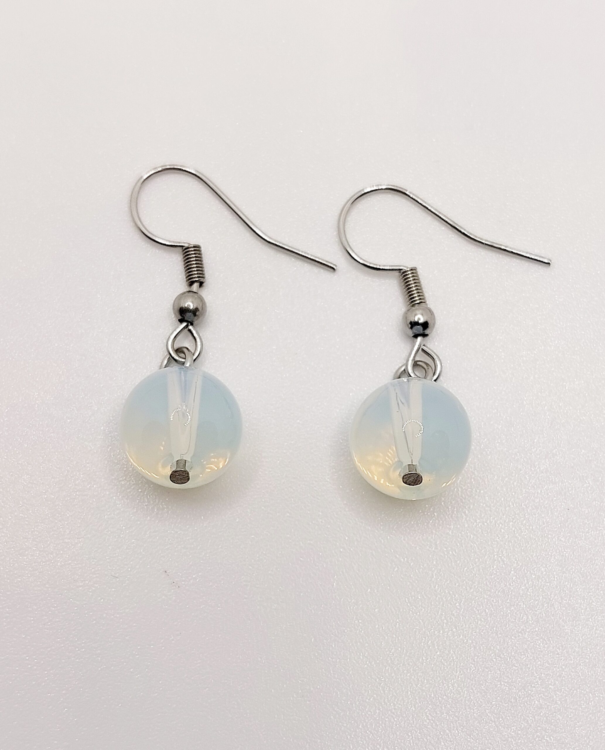Pendientes colgantes minimalistas diseñados con pequeñas cuentas de Opalita de 8 mm, montados en ganchos de acero inoxidable y bastones de acero, lo que garantiza durabilidad y resistencia al desgaste. La Opalita, con su brillo translúcido y destellos iridiscentes, aporta un toque sofisticado y versátil que combina con cualquier estilo. Estos pendientes son ligeros y cómodos, ideales para el uso diario o para ocasiones especiales.