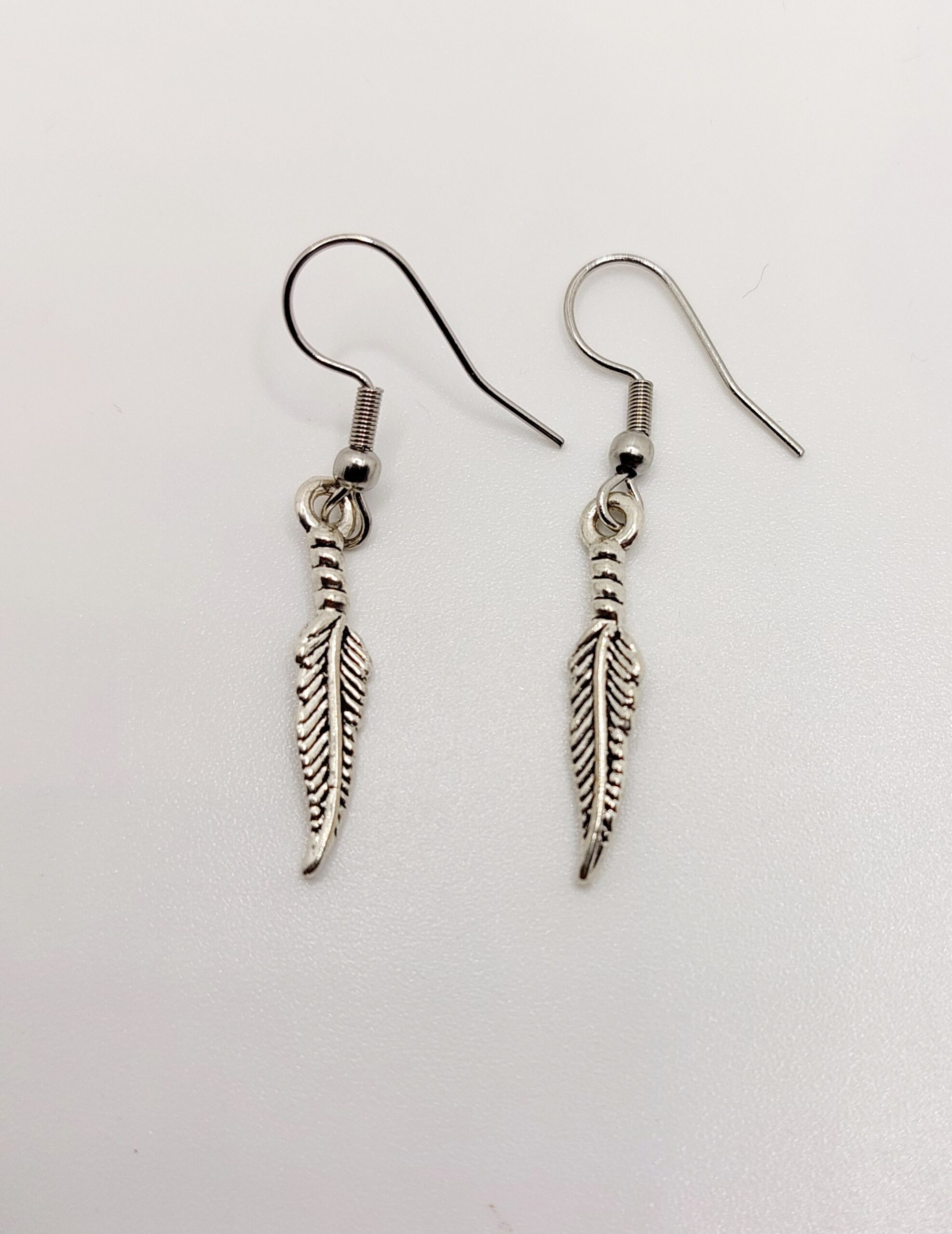 Pendientes pequeños con diseño de plumitas hechos en ZAMAk de color plateado. Tienen un acabado detallado que resalta el aspecto texturizado de la pluma. Los ganchos son de acero inoxidable, lo que garantiza durabilidad y evita posibles alergias. Las medidas de cada pendiente son 2,5 cm de largo por 0,4 cm de ancho, convirtiéndolos en un accesorio delicado y versátil.