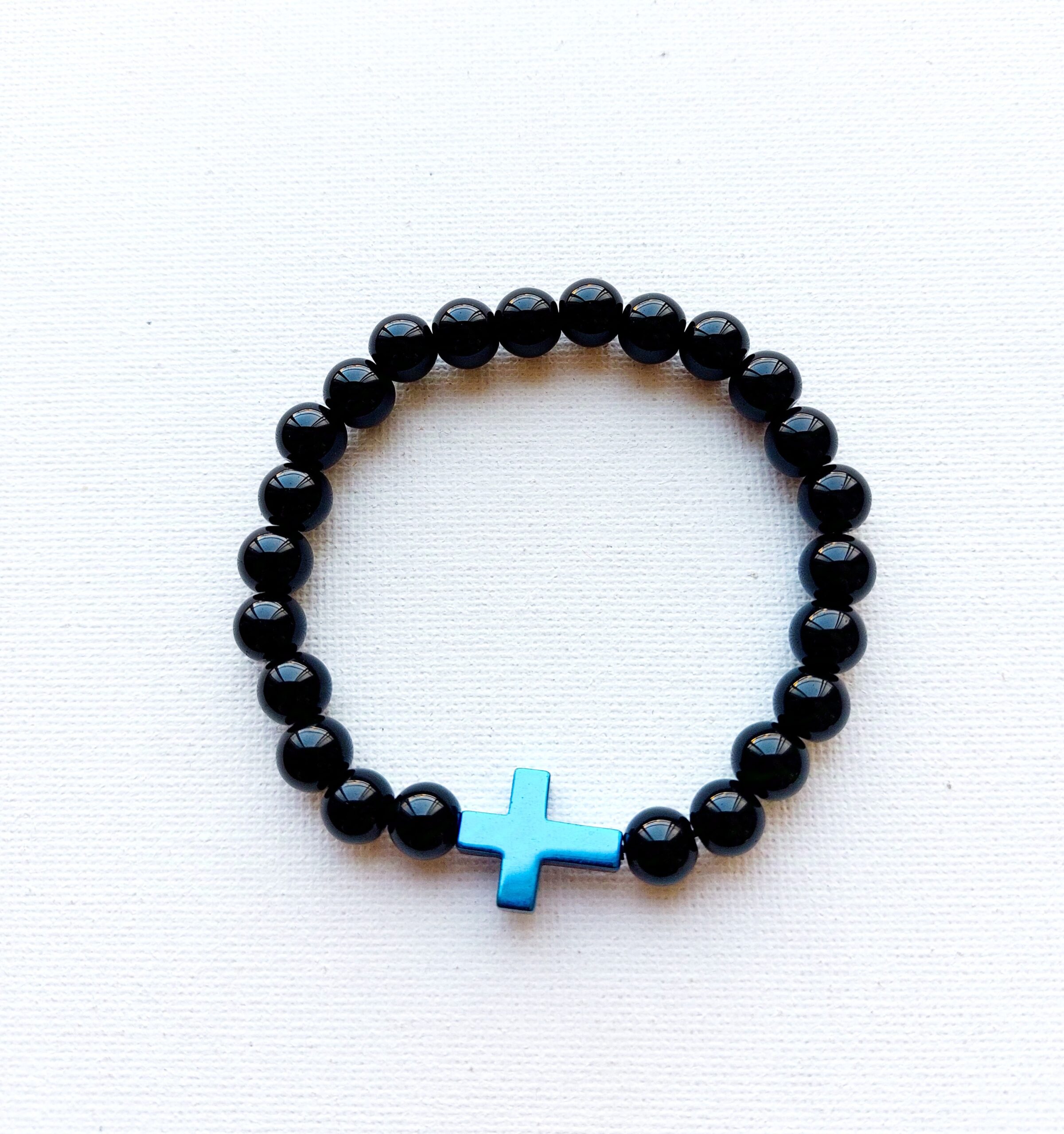 Pulsera elástica hecha con piedras negras pulidas que reflejan elegancia y simplicidad, combinadas con un detalle central en forma de cruz de acero en color azul metálico, que aporta un contraste moderno y llamativo. Ideal para quienes buscan un accesorio versátil y lleno de estilo.